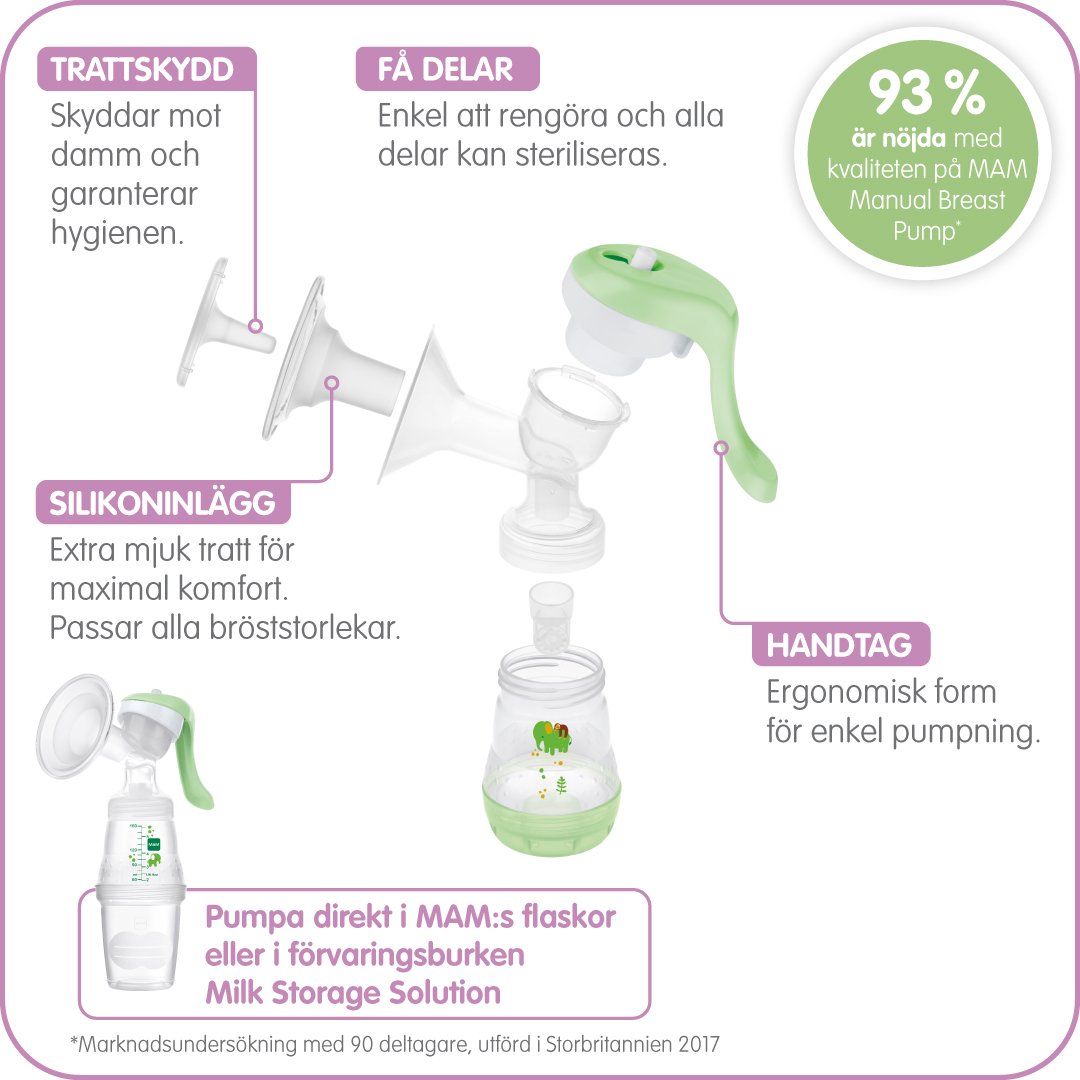 Liten och nätt bröstpump som är enkel att använda hemma eller ta med sig i väskan. Tratten, som är utformad att passa alla bröststorlekar, är ergonomisk och har ett mjukt, avtagbart silikonskydd för mesta möjliga komfort. Pumpen är kompatibel med MAM Easy Start och MAM Storage Solution. Pumpa direkt i flaska eller förvara i kyl eller frys! Enkelt och tidsbesparande! Alla delar av pumpen kan steriliseras.