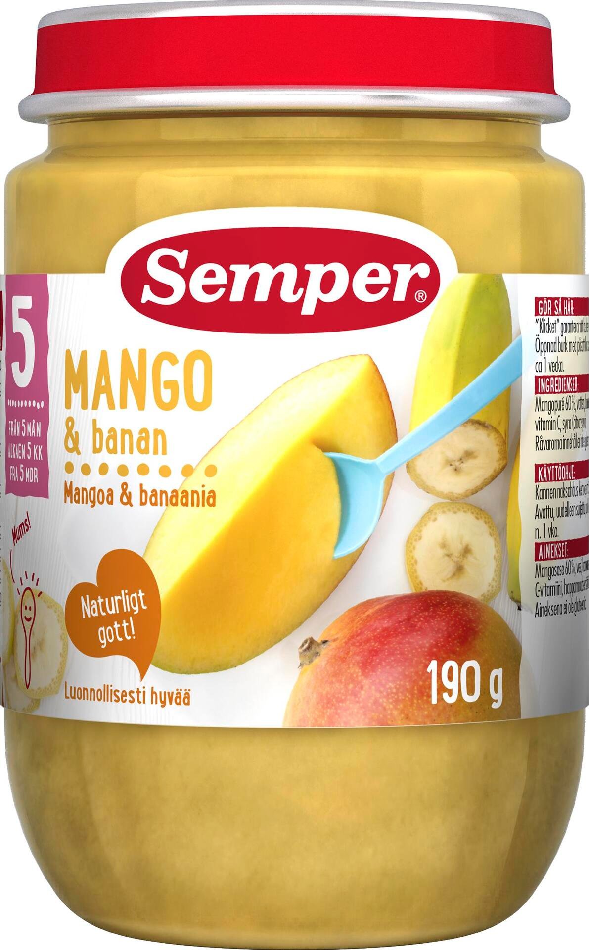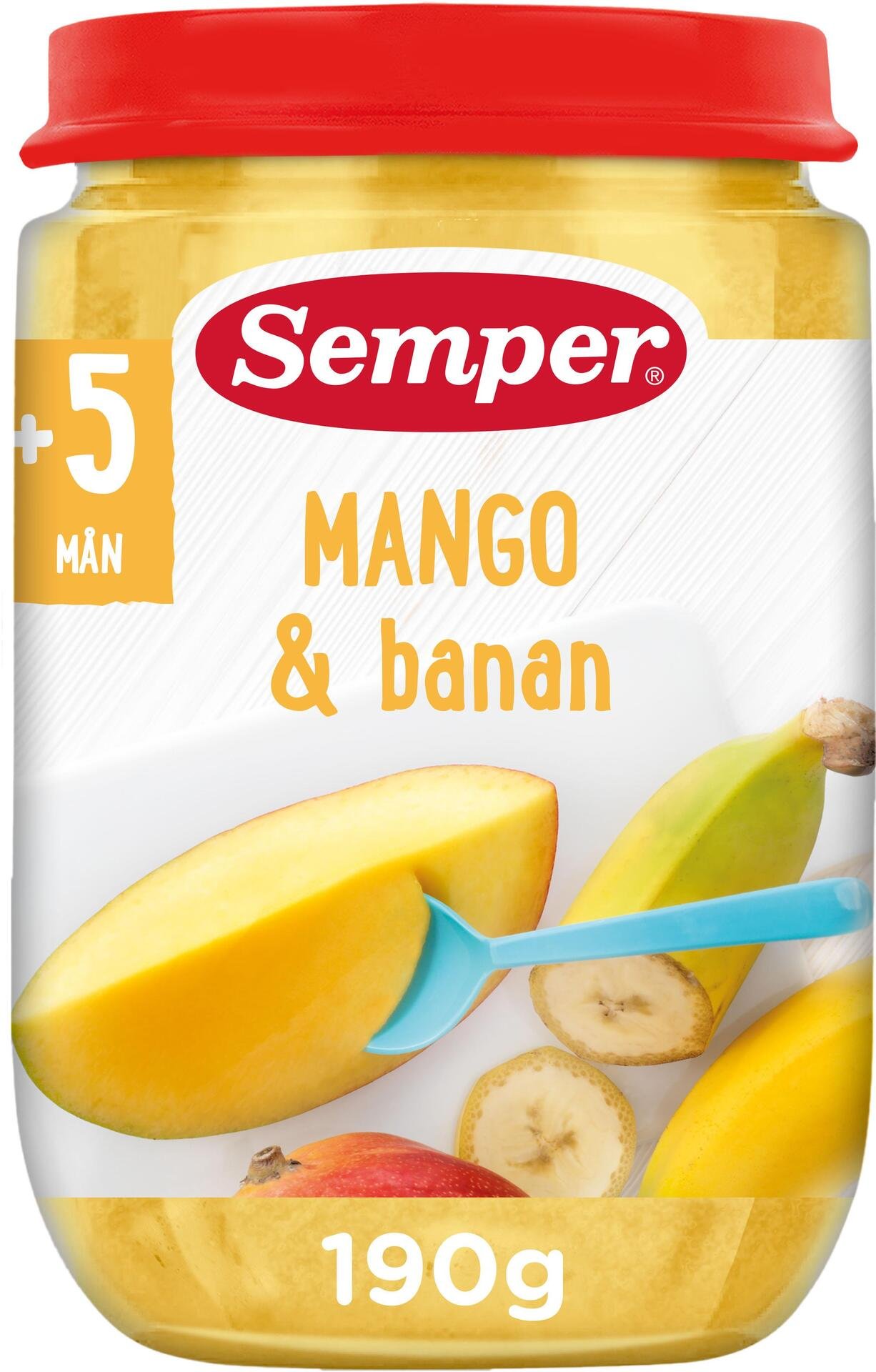 Semper Mango & Banan för barn från 5 månader. Mumsig fruktpuré som både mättar och ger energi. C-vitaminberikad med smak av mango och banan. Passar bra som smakportion vid introduktion av fast föda, senare som dessert eller mellanmål. Vikt 190g. Råvarorna innehåller inte gluten.