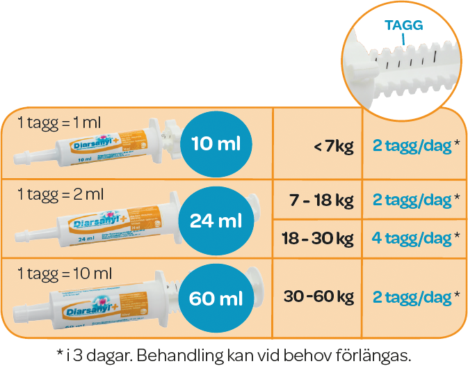 2 - 7 kg: 1 ml morgon och kväll i 3 dagar