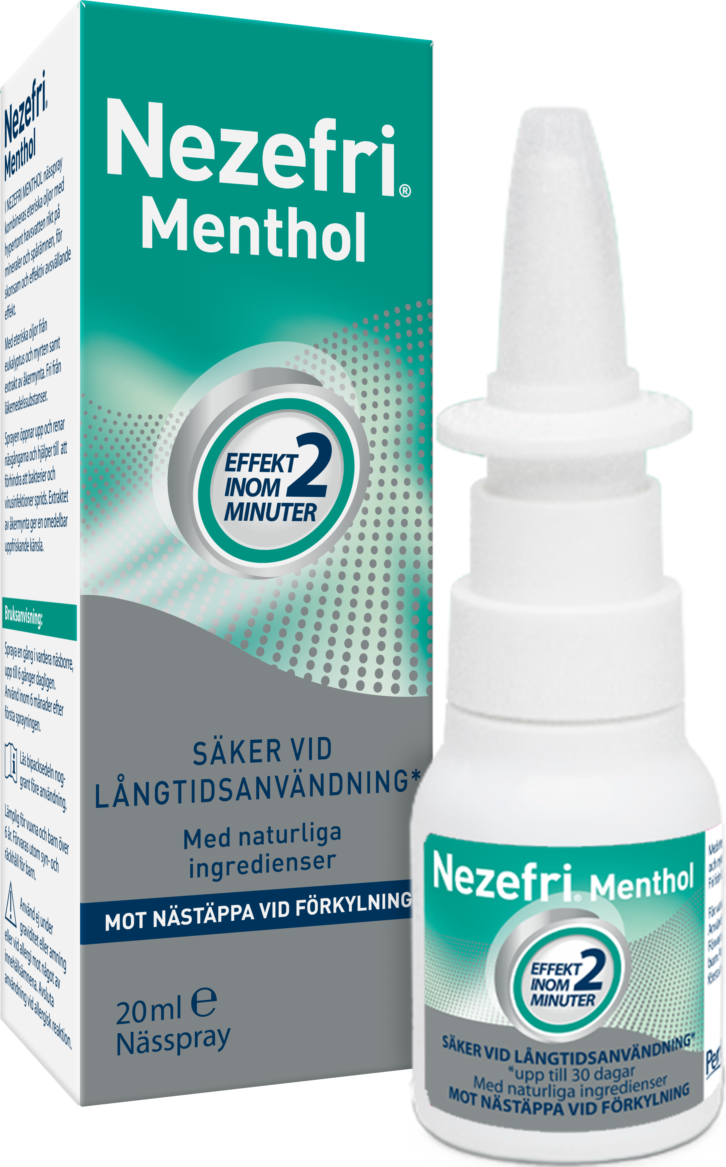 Nezefri Menthol är en nässpray som lindrar nästäppa med hjälp av naturliga ingredienser. Den kan användas från 6 års ålder och ger effekt redan inom 2 minuter. Nässprayen innehåller hypertont havsvatten för skonsamt, avsvällande effekt samt eteriska oljor som renar och friskar upp näsan.Nezefri Menthol klassas som en medicinteknisk produkt och är säker även vid långtidsanvändning (upp till 30 dagar.) Den ger inget beroende och kan med fördel användas som ett naturligt alternativ till avsvällande läkemedelsnässprayer eller som kombiation vid svårare förkylningstäppa.