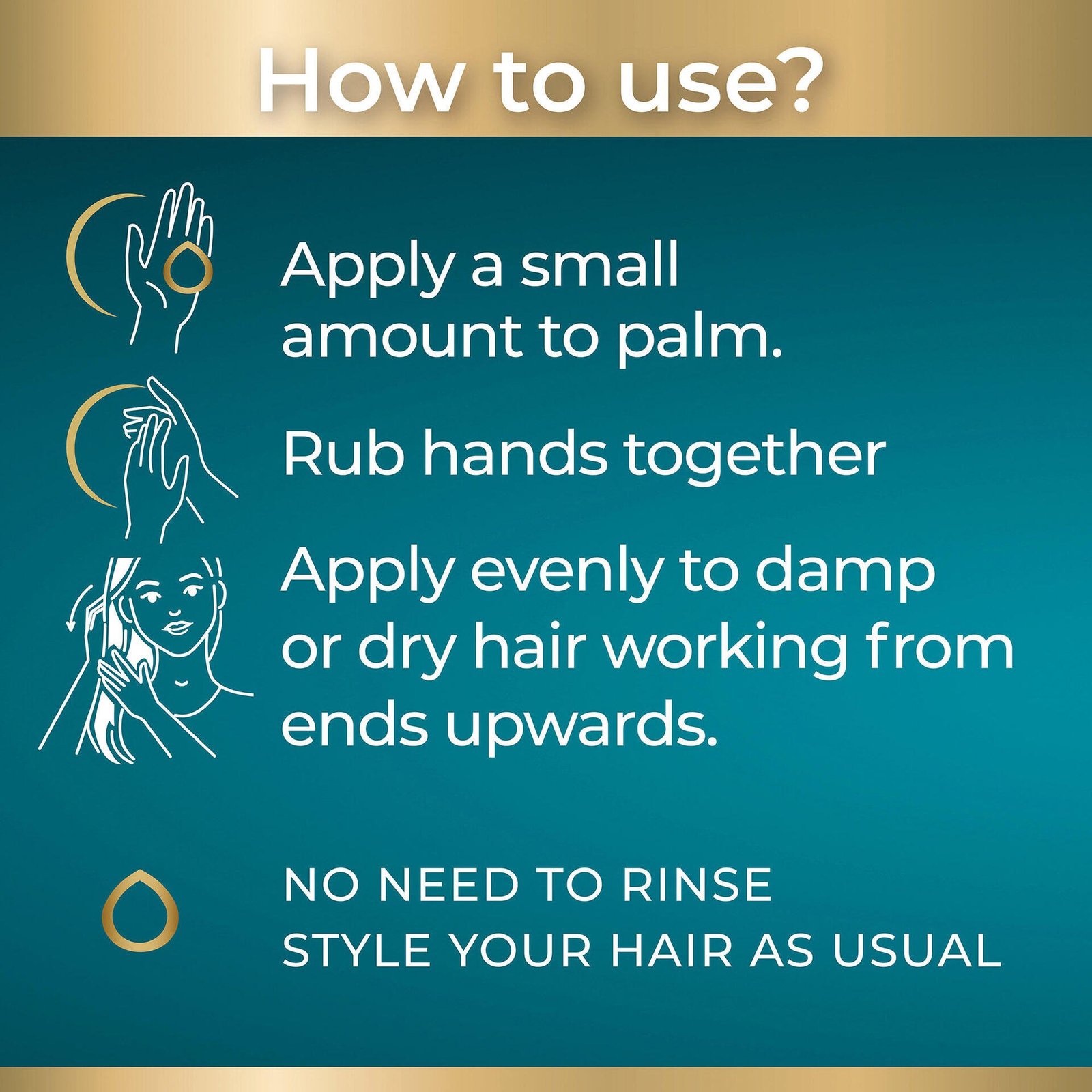 Applicera en liten mängd på handflatan, gnugga händerna mot varandra och applicera jämnt i fuktigt eller torrt hår från topparna och uppåt innan du går och lägger dig. Inget behov av att skölja. Styla som vanligt. För bästa resultat, använd 1-2 gånger i veckan.