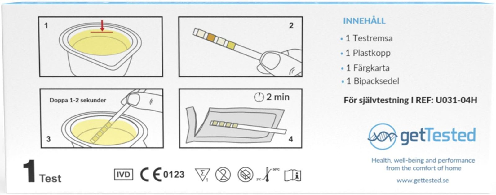 Testet tar du själv hemma genom ett urinprov. Du doppar teststickan i din urin i max en sekund, väntar 30-60 sekunder och avläser sedan resultatet genom att jämföra färgerna på teststickan mot jämförelsetabellen som kommer med i ditt testkit. Allt från test till svar görs hemifrån enkelt.