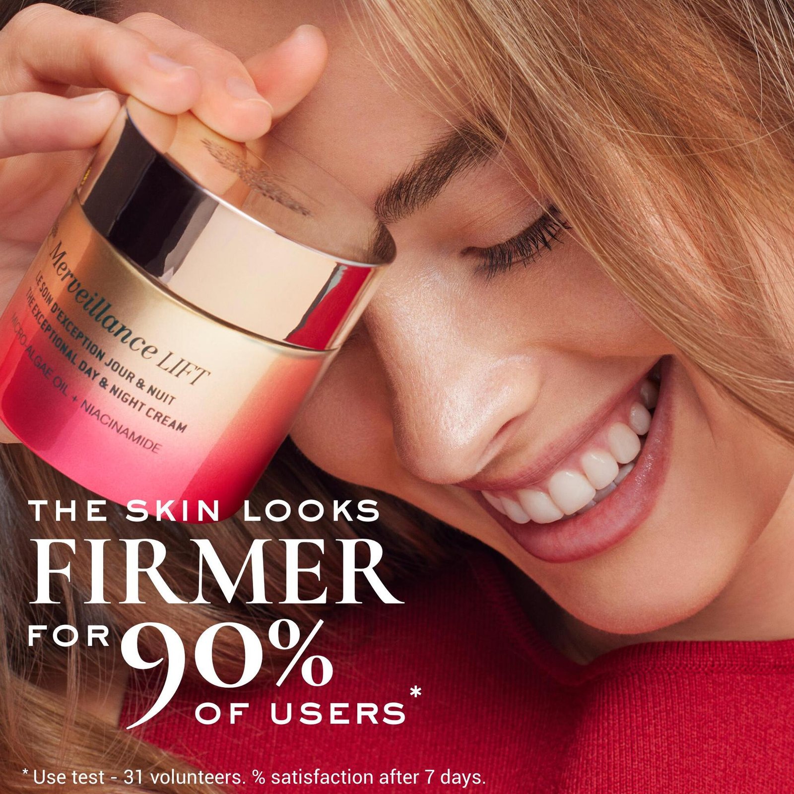 Ta en generös mängd, värm den försiktigt mellan dina händer och fördjupa dig i världen av den Exceptionella Dag- och Nattkrämen Merveillance Lift. Applicera på ditt ansikte med båda händerna platt, alltid arbeta från mitten och utåt (undvik ögonkonturområdet). Tveka inte att förlänga behandlingen till din hals och dekolletage. Massera tills krämen är helt absorberad. Avsluta med att lätt duttande (med fingertopparna) över hela ansiktet för att väcka din hudton. Använd morgon och kväll, helst efter din Nuxe-serum.