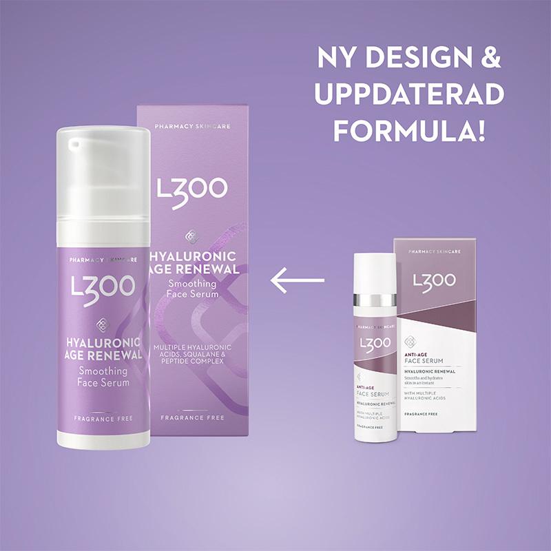 L300 Hyaluronic Age Renewal Face Serum hette tidigare L300 Hyaluronic Renewal Anti-Age Face Serum, och har nu en ny design och uppdaterat innehåll. Utjämnande ansiktsserum som omedelbart återfuktar och bidrar till att fina linjer upplevs mindre synliga samt ger en jämnare hud. Innehåller hyaluronsyra i två molekylstorlekar och squalane som hjälper till att bibehålla fukten i huden för en omedelbar och långvarig återfuktande effekt. Formulan inkluderar ett peptidkomplex samt ett extrakt från solblom som bidrar till en hud som upplevs spänstig. Oparfymerad och passar normal till torr hud, även dermatologiskt testad för känslig hud.
