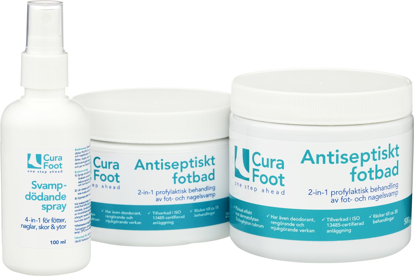 CuraFoot svampdödande spray används för att desinficera fötter, naglar, skor och ytor. Produkten är dermatologiskt testad, verkar mjukgörande och ger en fräsch doft efter applicering. CuraFoot dödar 99,99%* av svampen som orsakar fot- och nagelsvamp.