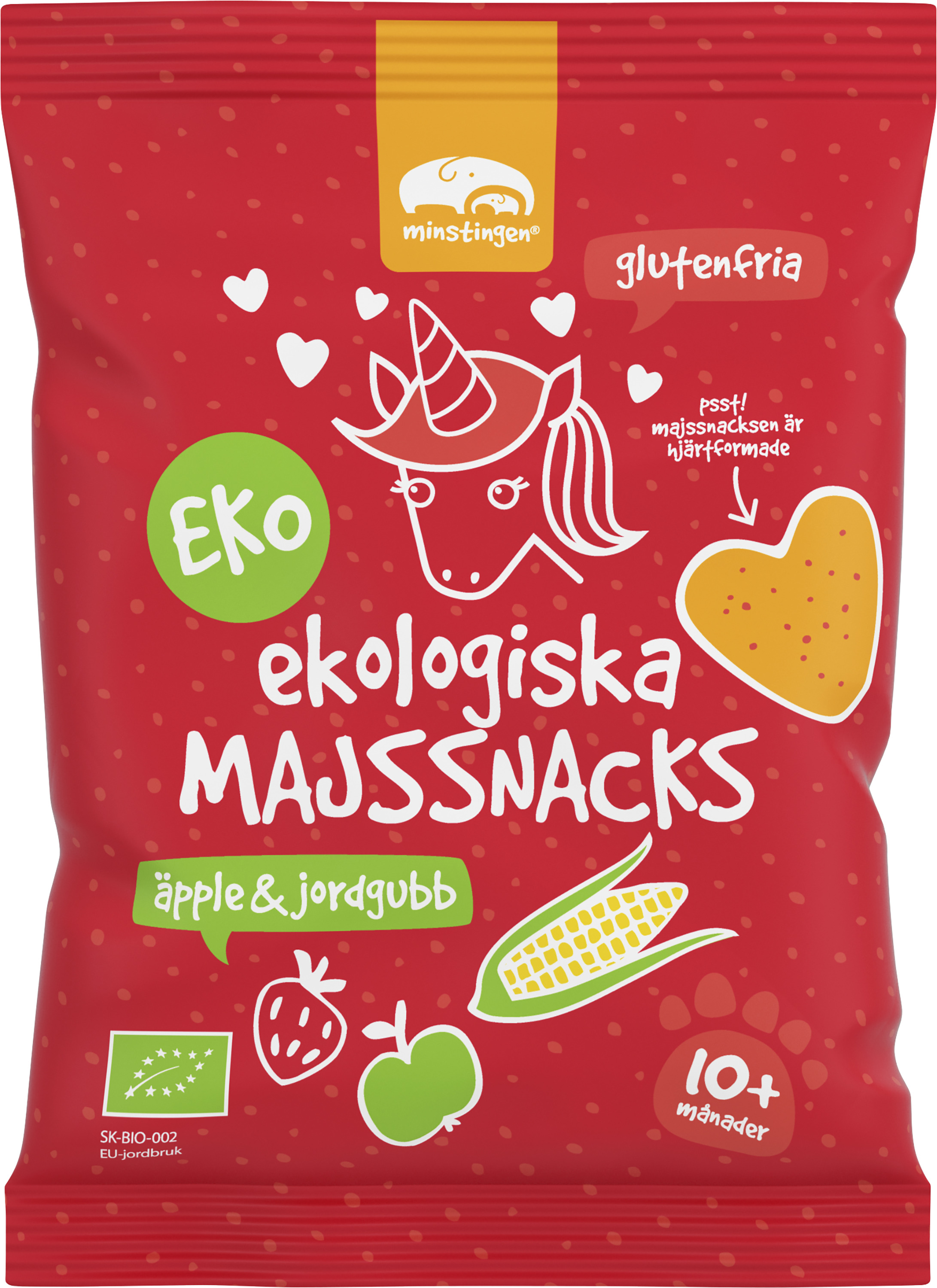Hjärtformade glutenfria majssnacks med smak av äpple och jordgubb. Innehåller 100% ekologiska råvaror. Perfekt mellis när din vilding behöver energi.