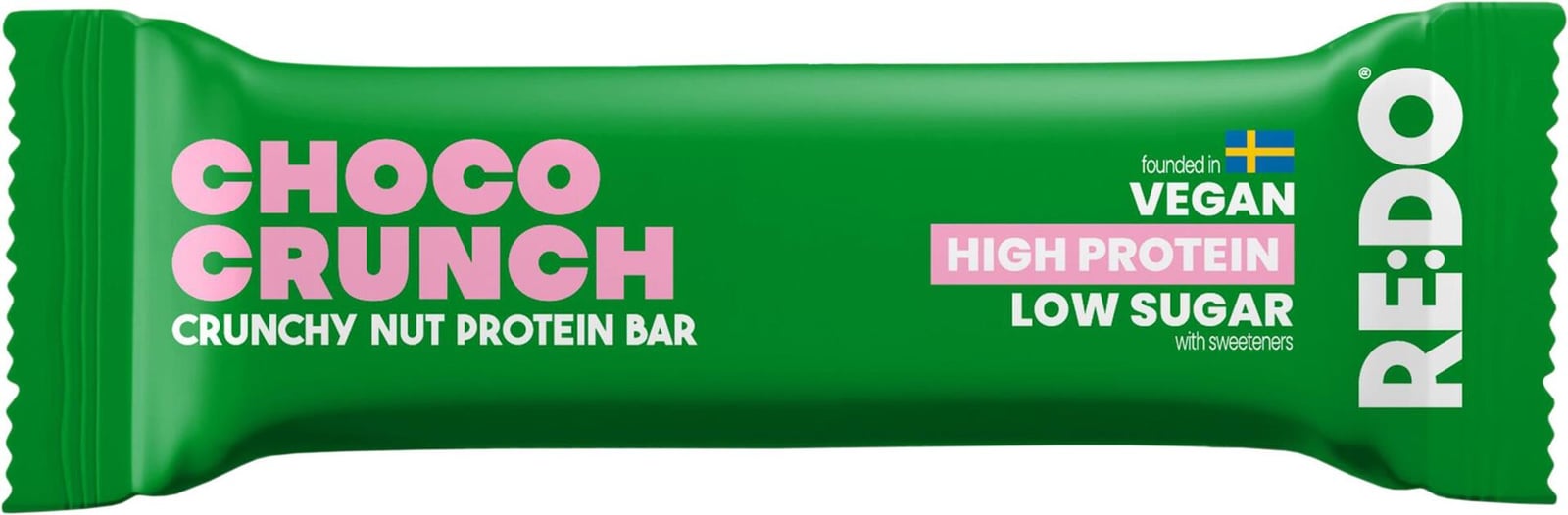 RE:DO Bar Choco Crunch är en växtbaserad bar med härlig smak av choklad och krispig textur. Den är gjord på ärtprotein och havre, vilket ger ett naturligt tillskott av protein och fibrer.