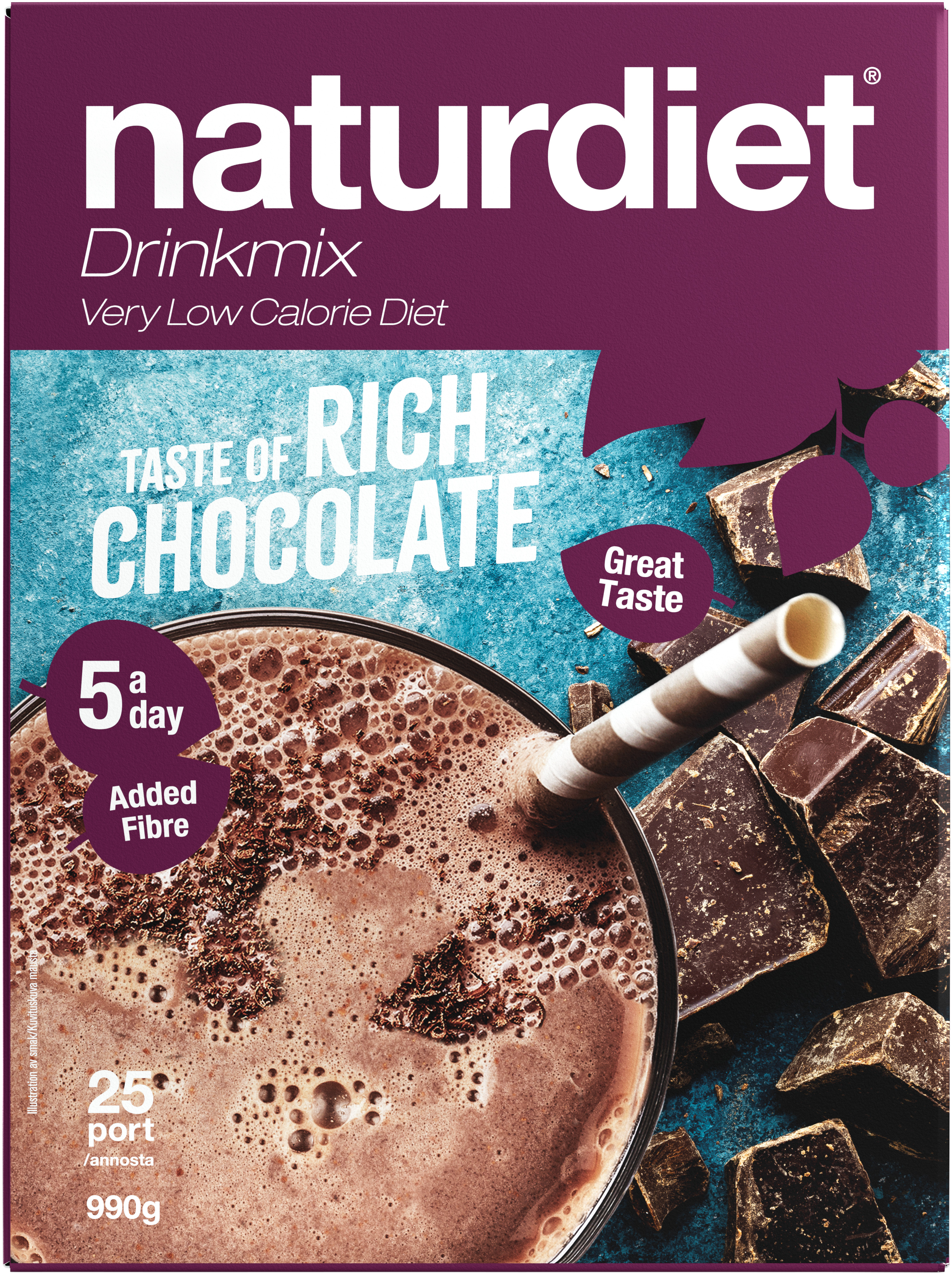 Naturdiet Drinkmix Choklad är en måltidsersättning med fantastiskt god smak av choklad och passar alla chokladälskare. Det är en komplett kostersättning med mycket lågt socker- och energiinnehåll (VLCD) och är utvecklad för dig som vill minska i vikt. En dag med Naturdiet drinkmix ger dig endast 774 kcal men täcker ändå hela dagsbehovet av de näringsämnen kroppen behöver. Dessutom har drinkmixen ett högt proteininnehåll.