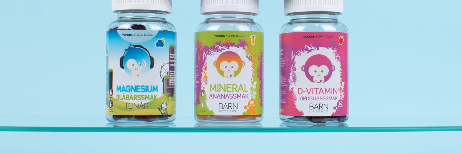 Monkids är ett litet familjeägt kosttillskottsföretag från Småland som erbjuder goda och färgglada vitaminer, mineraler och fiskolja i form av gummies. Monkids har produkter för barn, tonåringar och gravida. I sortimentet finns ett brett veganskt utbud och en övervägande majoritet av produkterna är svensktillverkade. Alla Monkids produkter är fria från artificiella sötningsmedel och är gluten- och laktosfria. Det finns perioder då barn petar i maten, inte får i sig tillräckligt med D-vitamin, aldrig äter grönsaker och vägrar äta fet fisk. Monkids har ett brett sortiment av produkter med bland annat flera multivitaminer, en microinkapslad fiskolja (som inte smakar det minsta fisk), C-vitamin+Zink och D-vitamin+Kalcium.