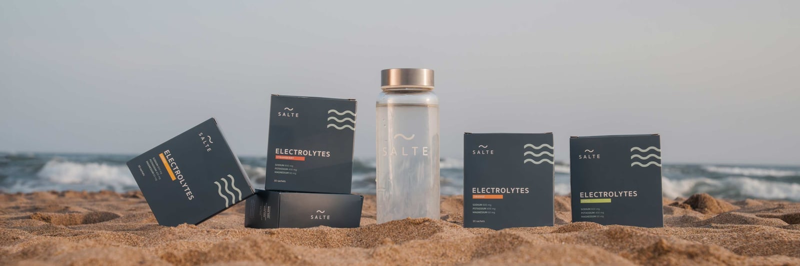 Varumärket SALTE grundades av en grupp svenskar och norrmän som upplevde ett gemensamt behov av bra och rena tillskott med elektrolyter att använda före eller efter träning och som vätskeersättning under varma sommardagar. När de inte kunde hitta motsvarande produkter på marknaden beslöt de sig helt enkelt för att börja tillverka sitt elektrolytpulver själva. Slutprodukterna döptes till SALTE (vilket betyder "att salta" på norska) och kombinerar olika elektrolyter i generösa mängder. Varje dospåse innehåller 800 mg natrium, 400 mg kalium och 60 mg magnesium. Förutom namnet, är SALTE trogen den skandinaviska livsstilen – rent och effektivt.