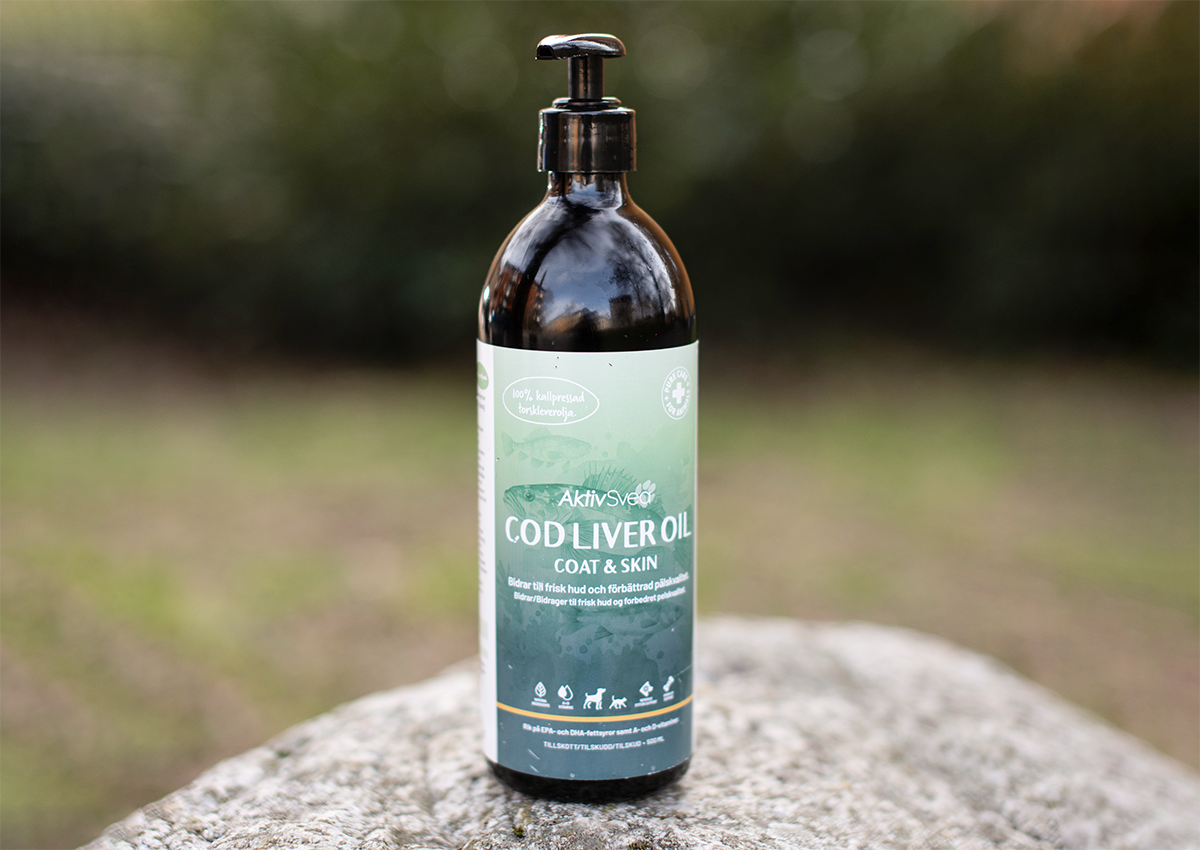 AktivSveas torskleverolja Cod Liver Oil Coat & Skin är ett kompletteringsfoder utformat för hundars (och även katters) allmänhälsa, hud och pälskvalitet. Tillverkad av 100% kallpressad torskleverolja, innehåller produkten en rik blandning av Omega-3 och Omega-6 fettsyror, samt viktiga vitaminer A och D, vilka är avgörande för att upprätthålla en frisk hud och glansig päls. Torskleveroljan är utvunnen från färsk lever av vildfångad torsk som fiskas på ett ansvarsfullt sätt (MSC-certifierad).