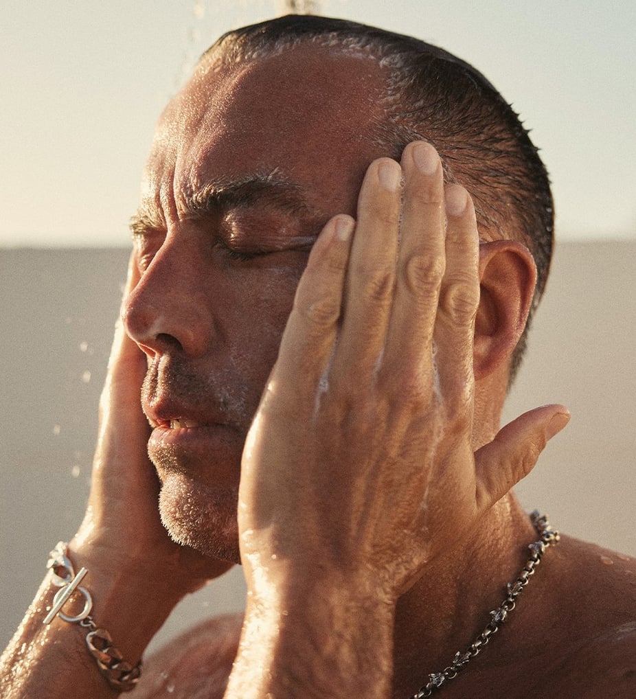 En bra rutin börjar alltid med en ansiktsrengöring för män. Jag föredrar en mild kräm med rik textur som är skonsam mot huden men ändå går på djupet. Har du använt solskydd i ansiktet kan du dubbelrengöra huden i två steg, först med en oljebaserad rengöring som städar undan och löser upp och sedan en vattenbaserad rengöring som balanserar.