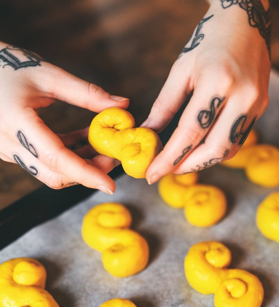 Knåda degen på mjölad bänk. Dela upp degen i portionsbitar och rulla ut till långsmala korvar. Rulla in ändarna åt motsatt håll för att forma lussebullar (som ett S).