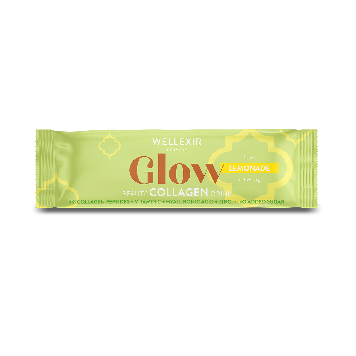 Wellexir Glow Beauty Drink Lemonade är en kollagendryck som innehåller vitamin C som bidrar till normal kollagenbildning, vilket har betydelse för hudens normala funktion. Samt zink som bidrar till att bibehålla normal hud, hår och naglar. Lättblandad dryck med 5 g kollagen, hyaluronsyra, zink och vitamin C. Produkten har en fräsch smak av lemonade och är sötad med stevia. Antal: 30 st med 6 g i varje.