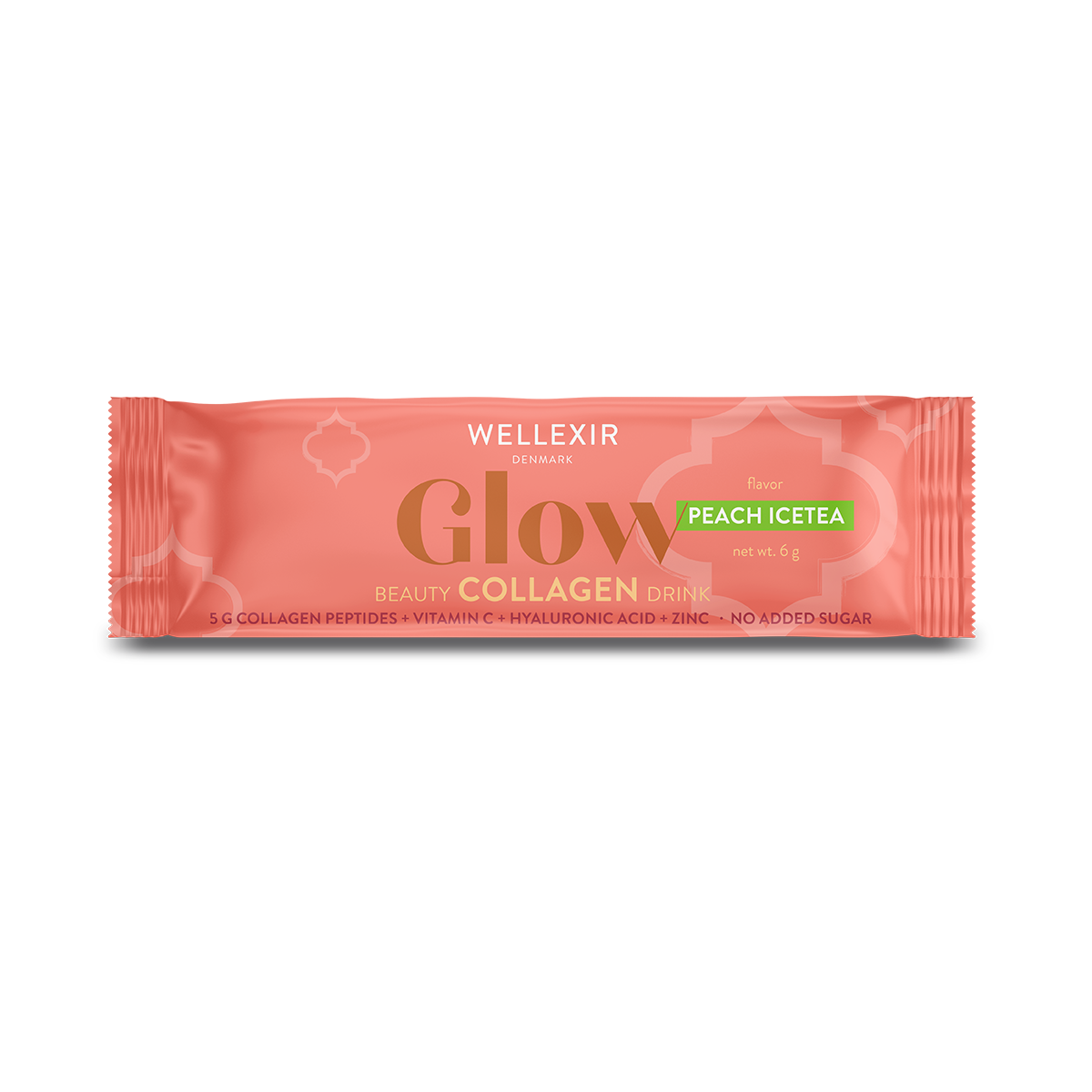 Wellexir Glow Beauty Drink Peach Ice Tea är en kollagendryck som innehåller vitamin C som bidrar till normal kollagenbildning, vilket har betydelse för hudens normala funktion. Samt zink som bidrar till att bibehålla normal hud, hår och naglar. Lättblandad dryck med 5 g kollagen, hyaluronsyra, zink och vitamin C. Produkten har en fruktig smak av persika iste och är sötad med stevia. Antal: 30 st med 6 g i varje.