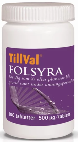 Tillval Folsyra är ett kosttillskott innehållande just folsyra. Rekommenderas till gravida och ammande men även för de som äter ensidigt och äldre som har problem med näringsintaget. Innehåller 100 stycken tabletter.